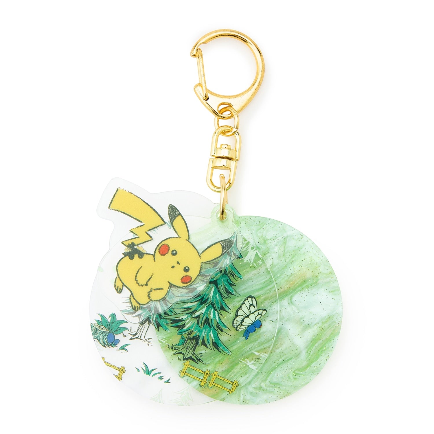 Add a touch of whimsy to your accessories with this elegant P’atelier Pikachu Butterfly Keychain from Pokémon Center Japan! Featuring Pikachu playfully posed among butterflies and forest scenery, this layered acrylic charm has a soft pastel background and gold-tone clasp for a refined finish. A perfect collectible for Pokémon fans who love stylish, subtle merch.